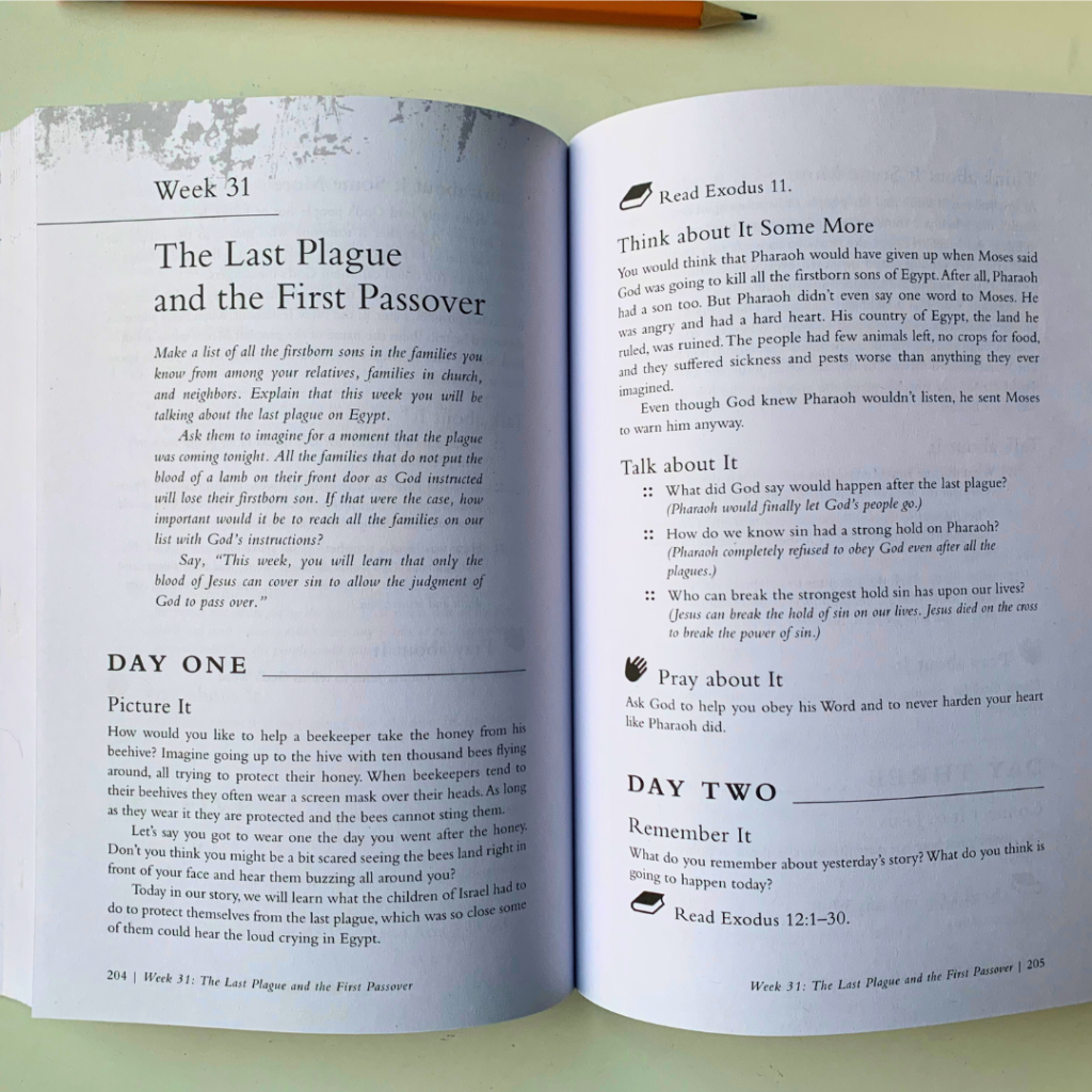 The devotion book that we stuck with for most of the year was 365 Trivia Twist Devotions. This devotion is family friendly and engaging. It doesn’t really go in depth, but it was a great fit for what we needed at the time.