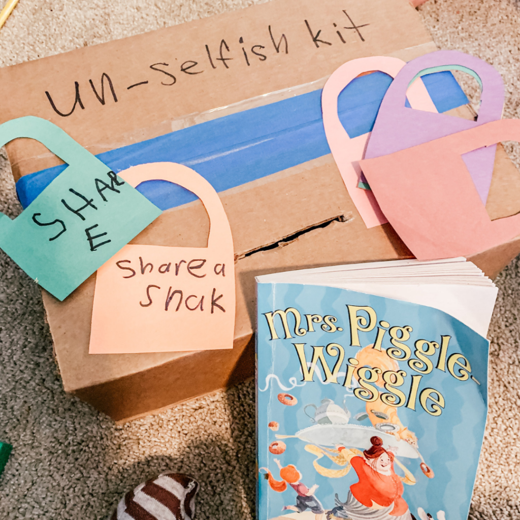 Our “Un-Selfish Kit” inspired by Mrs. Piggle Wiggle’s kit – We discussed actions that were kind and not selfish.