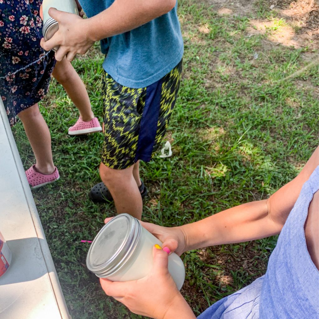 Fill the mason jar half way with cream. I made one for each family. It takes quite a bit of endurance, so sharing the job among the family members made it easier to complete. Put the lid on tight and start shaking the jar with all your might.