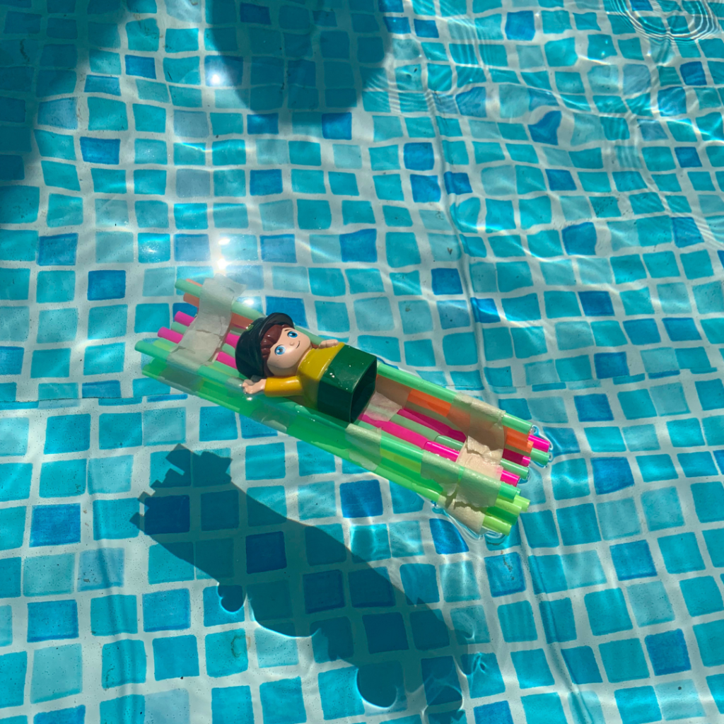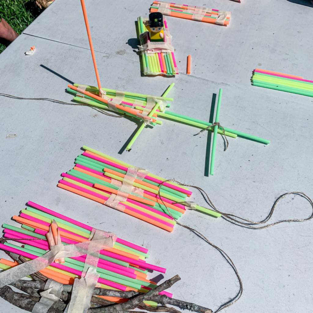For this activity, I set up a STEM challenge, and it was such a hit! I provided the kids with a basket of supplies: straws, string, masking tape, and sticks from my yard. We talked about how rafts are made, and then I let the children have the freedom to make whatever they wanted. Their goal was to make a raft that a little lego man could float on successfully.