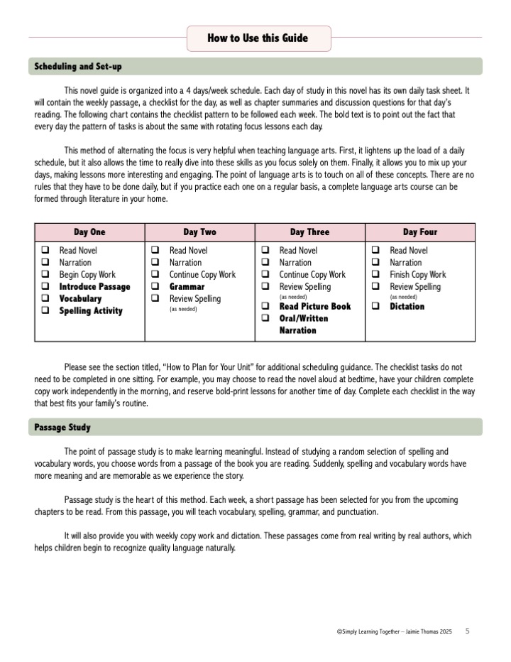 Inside, you’ll find clear daily plans, age-flexible activities, and thoughtful guidance that help you teach spelling, writing, narration, vocabulary, literary devices, and reading comprehension—all through the pages of one great book. No busywork. No fluff. Just purposeful, meaningful learning rooted in stories your kids will remember.