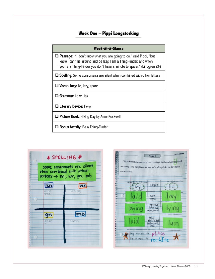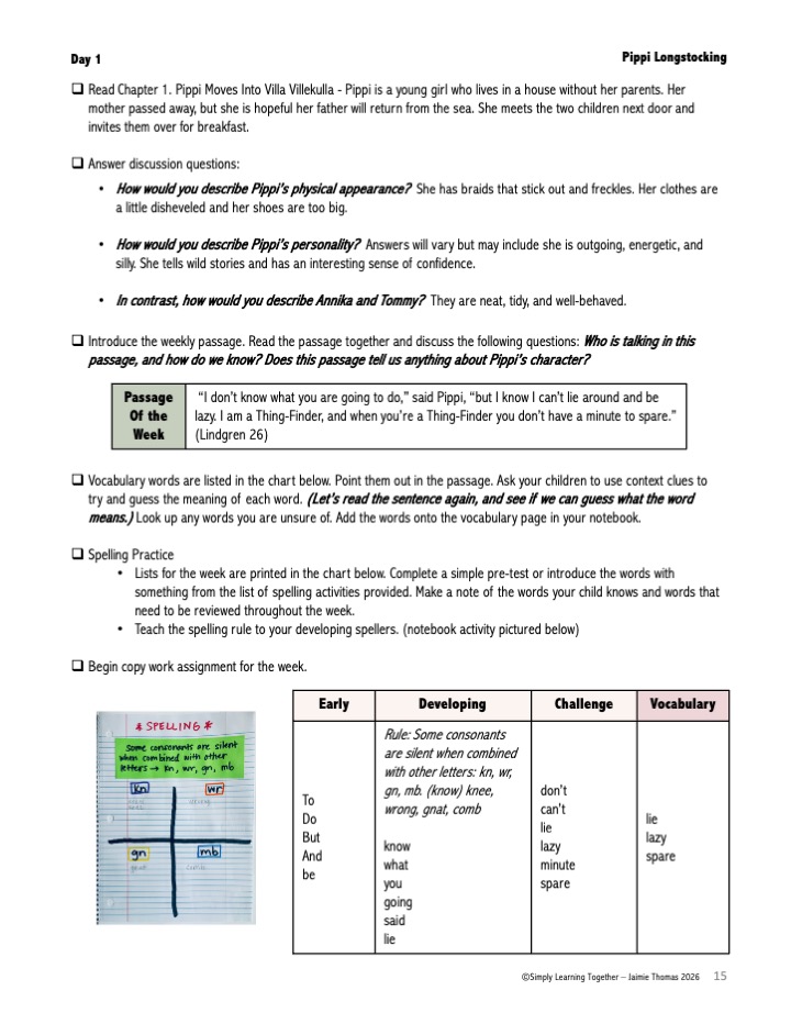 This guide uses passage study to anchor every lesson in the story you’re reading. Spelling words, grammar discussions, copy work, and dictation all come directly from the novel—so learning feels connected and memorable.