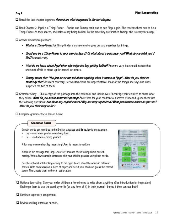 This family-style novel study for Pippi Longstocking helps you teach comprehension, vocabulary, spelling, grammar, and writing in a natural and meaningful way—using the novel itself as your guide. Instead of jumping between workbooks and separate subjects, your family gathers around one great book and explores the subject together.