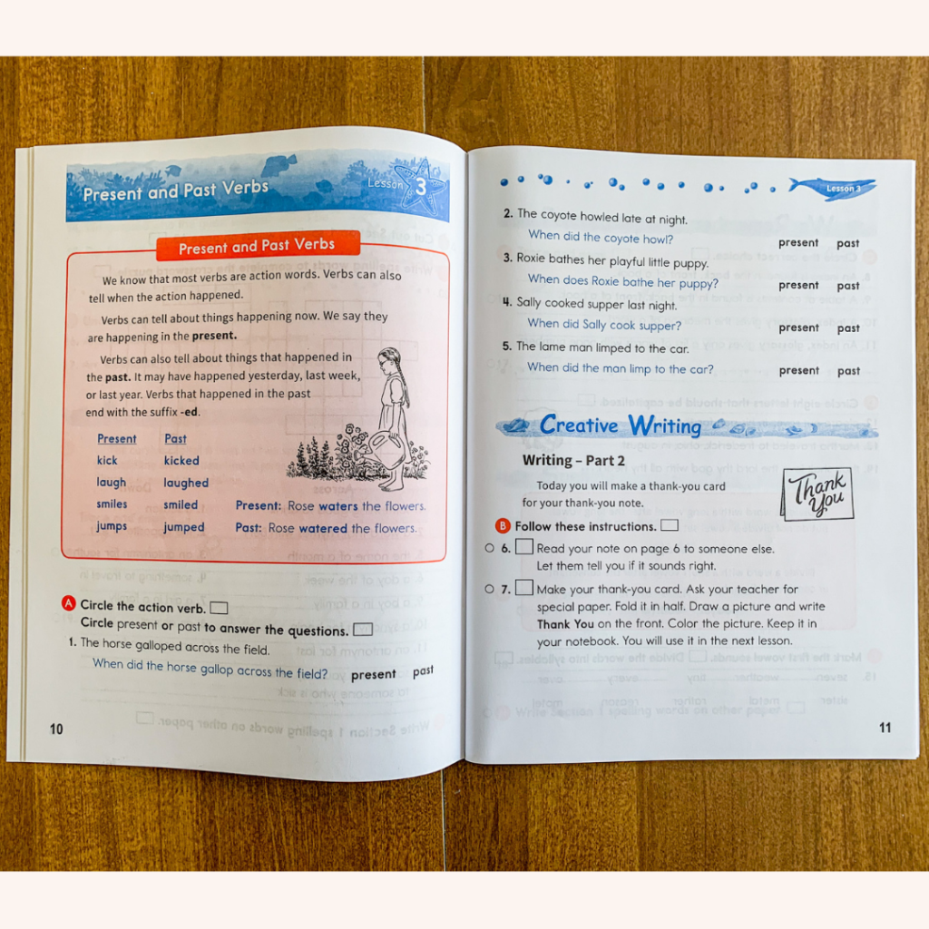 A LightUnit comes with the lessons, 2 quizzes, a self-check, and a test. One lesson usually begins with a new language skill followed by phonics and grammar review. Next, there is a short penmanship section to practice handwriting and, lastly, spelling practice.